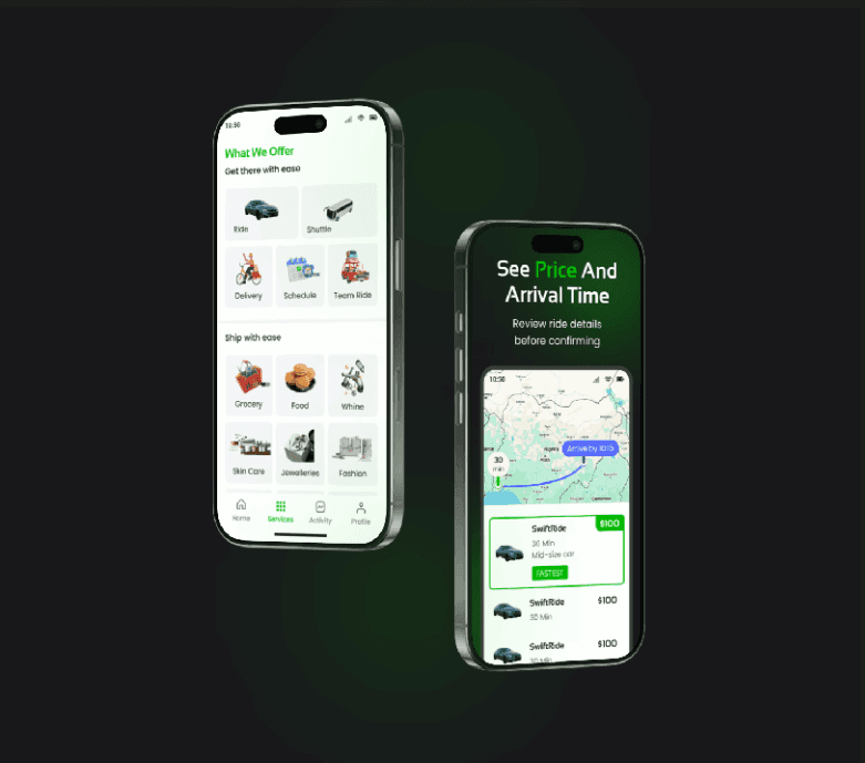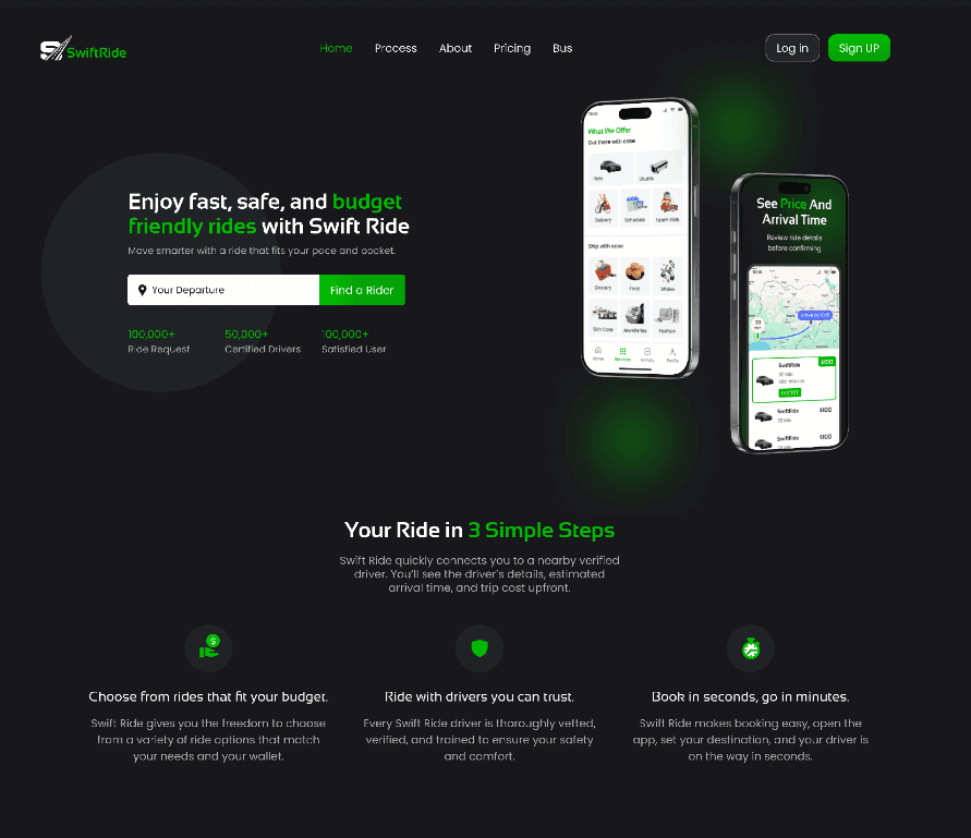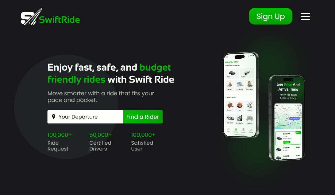 A modern ride-hailing app designed with a sleek, intuitive interface. It focuses on seamless booking, real-time tracking, and a smooth user experience across all devices.